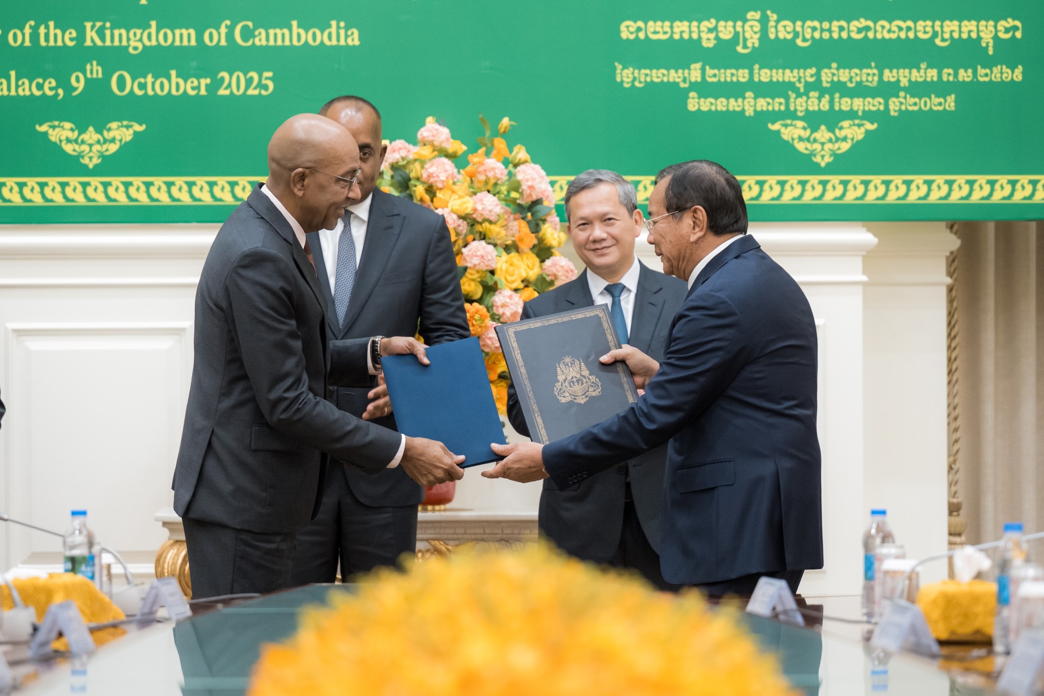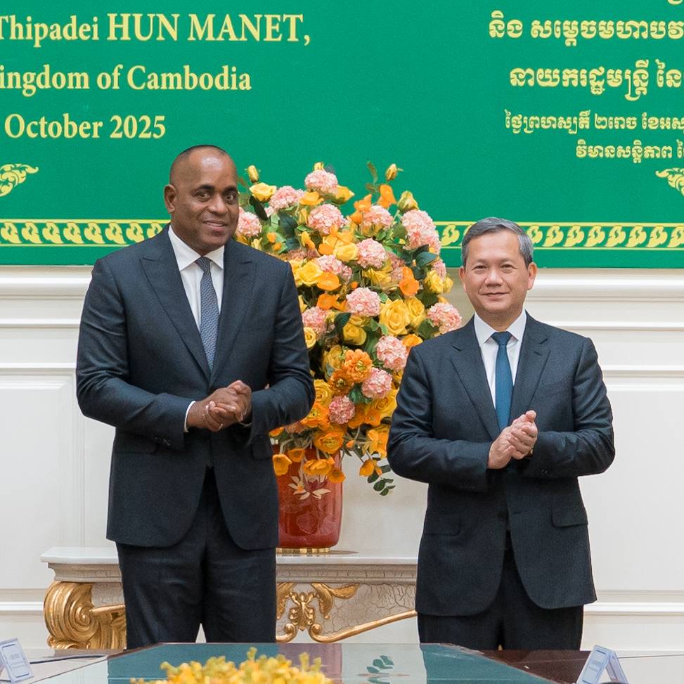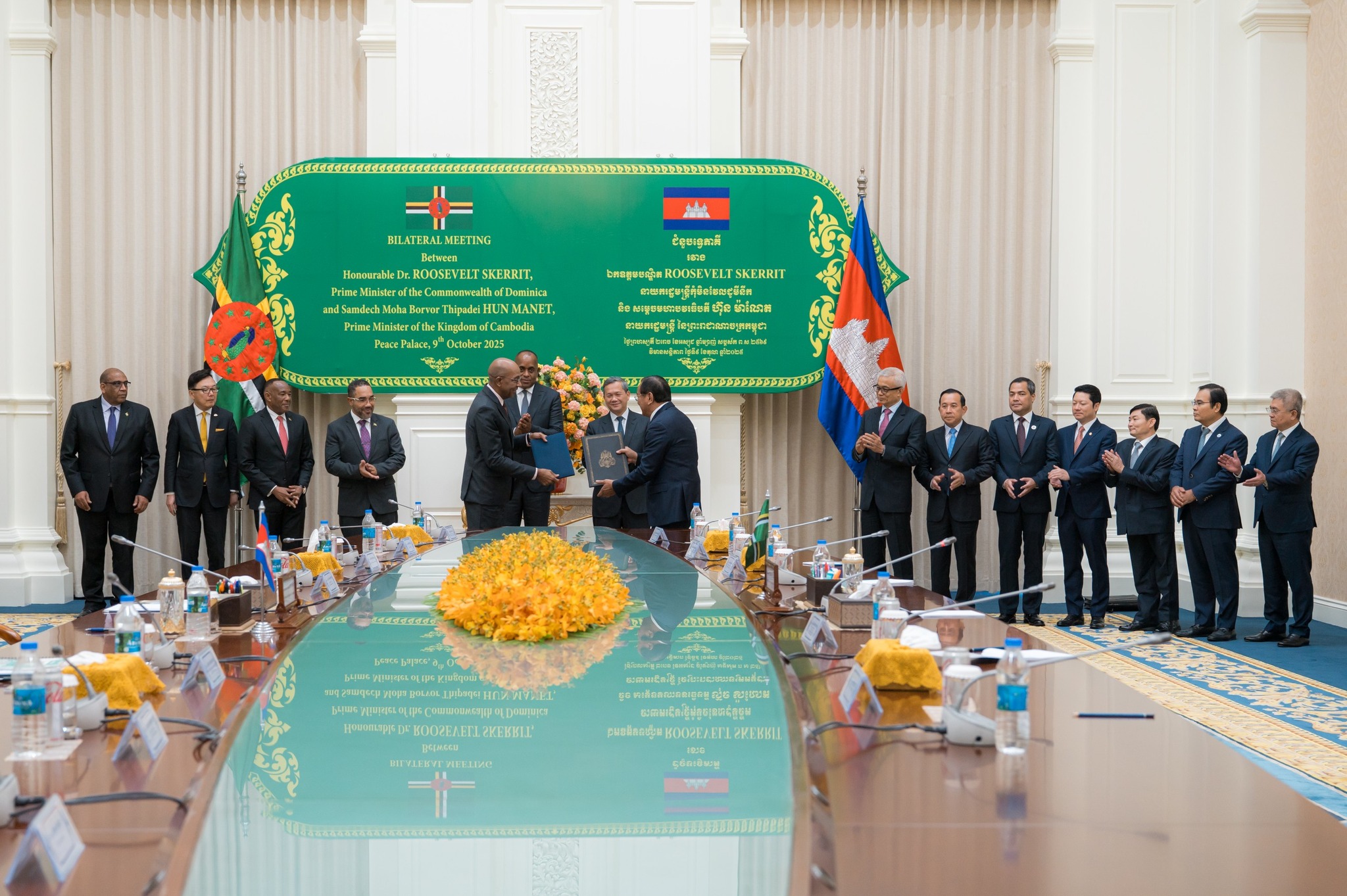 នាព្រឹកថ្ងៃព្រហស្បតិ៍ ២រោច ខែអស្សុជ ឆ្នាំម្សាញ់ សប្តស័ក ពុទ្ធសករាជ ២៥៦៩ ត្រូវនឹងថ្ងៃទី៩ ខែតុលា ឆ្នាំ២០២៥ នៅវិមានសន្តិភាព ឯកឧត្តម ថោ ជេដ្ឋា រដ្ឋមន្ត្រីក្រសួងធនធានទឹក និងឧតុនិយម បានអញ្ជើញអមសម្តេចមហាបវរធិបតី ហ៊ុន ម៉ាណែត នាយករដ្ឋមន្ត្រីនៃព្រះរាជាណាចក្រកម្ពុជា ជួបពិភាក្សាការងារទ្វេភាគីជាមួយឯកឧត្តម រ៉ូសឺវែល ស្កឺរីត (Roosevelt Skerrit) នាយករដ្ឋមន្ត្រីនៃកុំមិនវែលដូមីនីក និងគណៈប្រតិភូជាន់ខ្ពស់ ក្នុងឱកាសនៃដំណើរទស្សនកិច្ចការងារនៅព្រះរាជាណាចក្រកម្ពុជា។