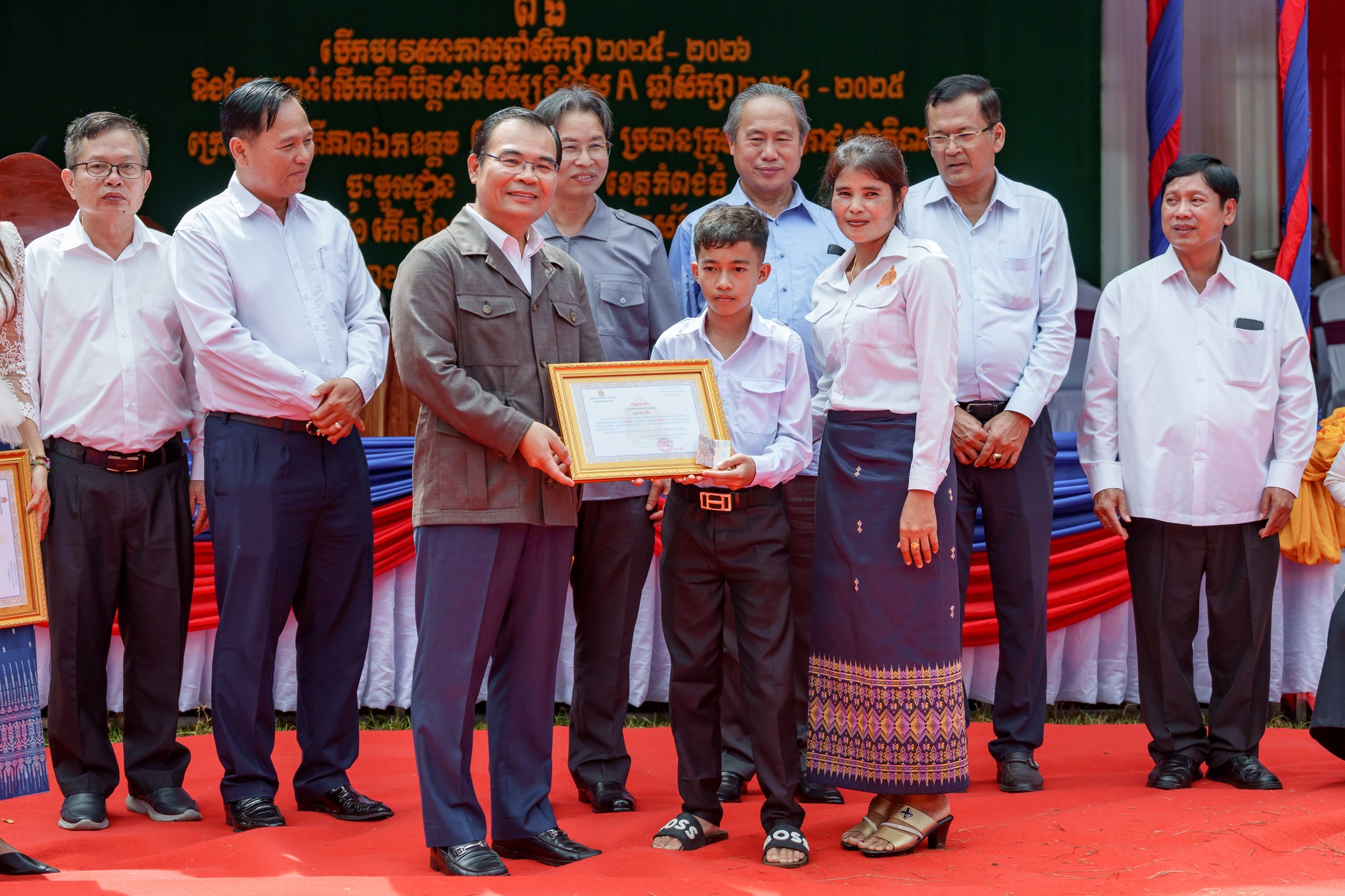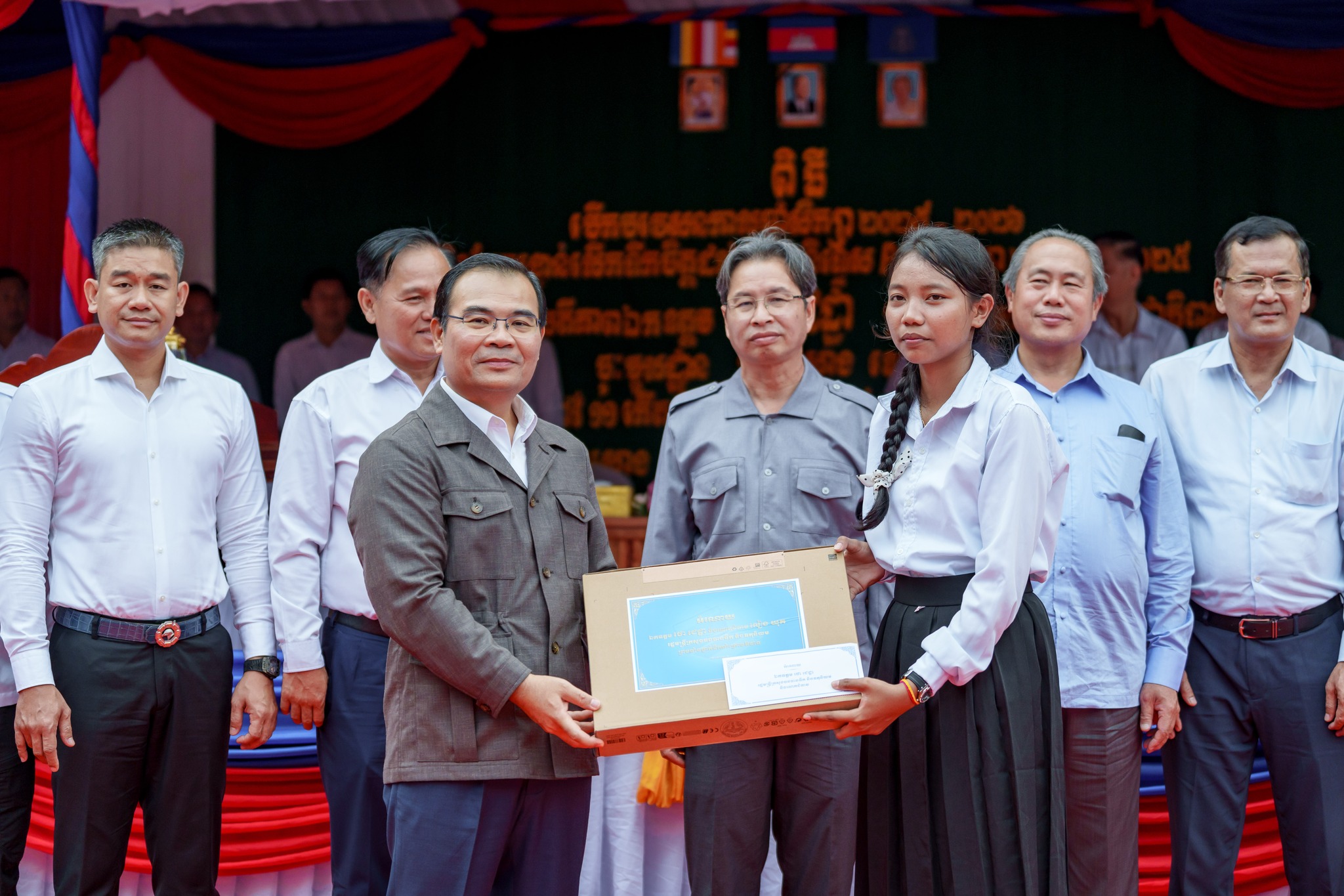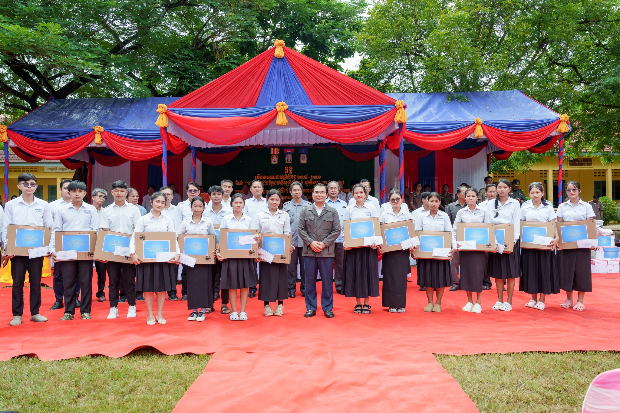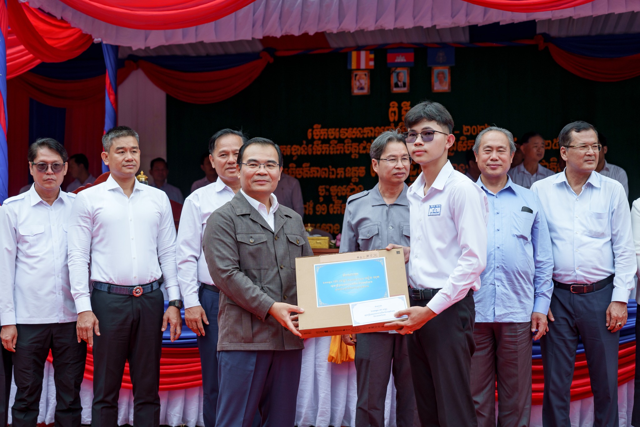 សូមបញ្ជាក់ថា រង្វាន់ជាសម្ភារ និងថវិកា ដែលប្រគល់ជូនដល់សិស្សានុសិស្សនាពេលនេះរួមមាន៖ ១)សិស្សនិទ្ទេសA ចំនួន១៥នាក់ ក្នុងម្នាក់ៗទទួលបានកុំព្យូទ័រយួរដៃចំនួន ១គ្រឿង និងថវិកាចំនួន ៤០ម៉ឺនរៀល ២)សិស្សចូលរួមសរុប ២០១២នាក់ ក្នុងម្នាក់ៗទទួលបានថវិកា ១ម៉ឺនរៀល ៣)ឧបត្ថម្ភវិទ្យាល័យរស្មីសោភ័ណ ថវិកា ២លានរៀល តុកៅអីសិស្ស ១០ឈុត បាល់ទាត់ និងបាល់បោះ ២០គ្រាប់ សៀវភៅសរសេរ ១០០០ក្បាល ប៊ិច ២០០០ដើម និងក្រដាសរ៉ាម ១០កេស លោកគ្រូអ្នកគ្រូ ចំនួន ៦២នាក់ ក្នុងម្នាក់ៗថវិកាចំនួន ៥ម៉ឺនរៀល ៤)ឧបត្តម្ភវិទ្យាល័យជាស៊ីមប្រឡាយចំនួន ២លានរៀល វិទ្យាល័យហ៊ុនសែនរុងរឿងចំនួន ២លានរៀល និងវិទ្យាល័យហ៊ុនសែនចំណាលើចំនួន ២លានរៀល៕