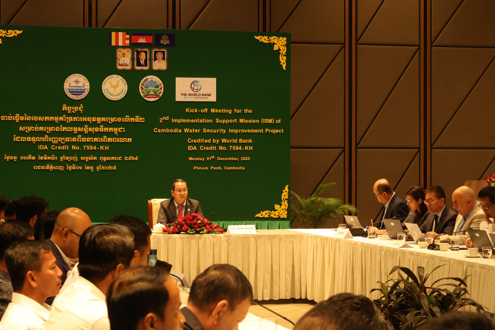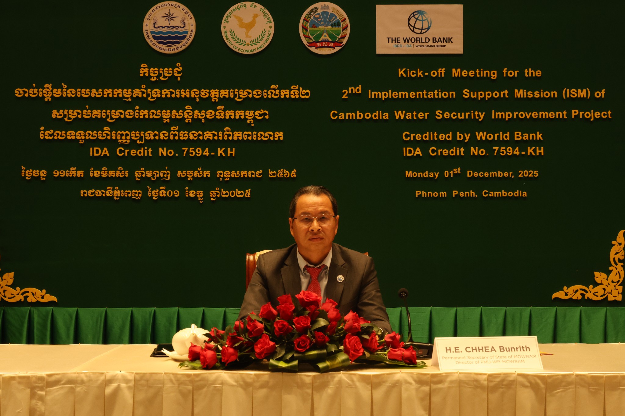 នៅសណ្ឋាគារសាន់អែនម៉ូន នាព្រឹកថ្ងៃចន្ទ ១១កើត ខែមិគសិរ ឆ្នាំម្សាញ់ សប្តស័ក ពុទ្ធសករាជ ២៥៦៩ ត្រូវនឹងថ្ងៃទី១ ខែធ្នូ ឆ្នាំ២០២៥ ឯកឧត្តម ឈា ប៊ុនរិទ្ធ រដ្ឋលេខាធិការប្រចាំការ និងជានាយកអង្គភាពគ្រប់គ្រងគម្រោងក្រោមហិរញ្ញប្បទានពីធនាគារពិភពលោក ក្នុងនាមតំណាងដ៏ខ្ពង់ខ្ពស់ឯកឧត្តម ថោ ជេដ្ឋា រដ្ឋមន្រ្តីក្រសួងធនធានទឹក និងឧតុនិយម បានអញ្ជើញចូលរួមជាគណៈអធិបតីបើកកិច្ចប្រជុំបេសកកម្មគាំទ្រលើការអនុវត្តគម្រោងលើកទី២ របស់គម្រោងកែលម្អសន្តិសុខទឹកកម្ពុជា ក្រោមហិរញ្ញប្បទានពីធនាគារពិភពលោក។