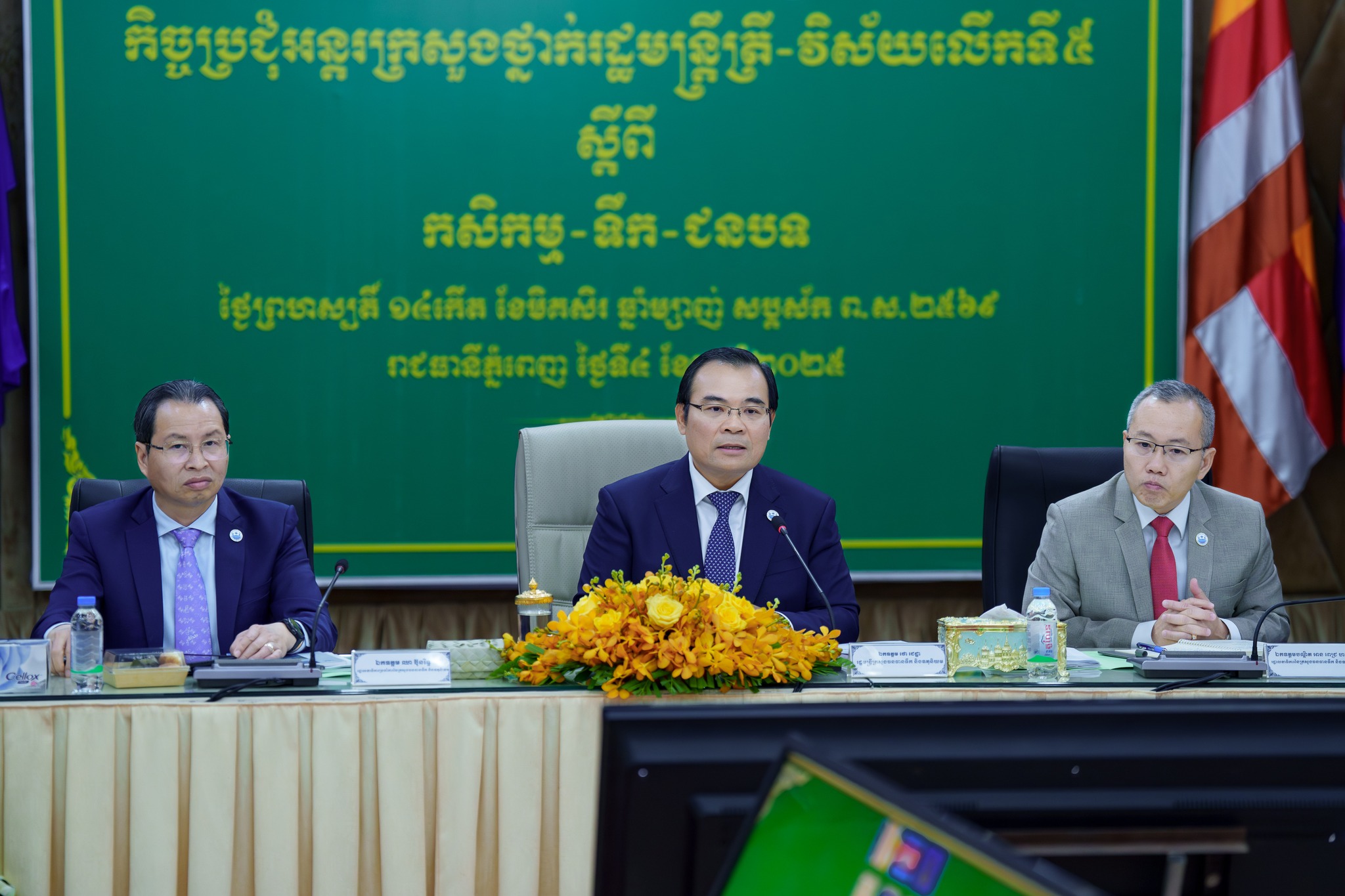 នាព្រឹកថ្ងៃព្រហស្បតិ៍ ១៤កើត ខែមិគសិរ ឆ្នាំម្សាញ់ សប្តស័ក ពុទ្ធសករាជ ២៥៦៩ ត្រូវនឹងថ្ងៃទី៤ ខែធ្នូ ឆ្នាំ២០២៥ នៅទីស្តីការក្រសួងធនធានទឹក និងឧតុនិយម ឯកឧត្តម ថោ ជេដ្ឋា រដ្ឋមន្ត្រីក្រសួងធនធានទឹក និងឧតុនិយម ឯកឧត្តម ឌិត ទីណា រដ្ឋមន្ត្រីក្រសួងកសិកម្ម រុក្ខាប្រមាញ់ និងនេសាទ និងឯកឧត្តម ឆាយ ឫទ្ធិសែន រដ្ឋមន្ត្រីក្រសួងអភិវឌ្ឍន៍ជនបទ បានអញ្ជើញជាសហប្រធានដឹកនាំកិច្ចប្រជុំអន្តរក្រសួងថ្នាក់រដ្ឋមន្ត្រីត្រី-វិស័យលើកទី៥ ស្ដីពីការសម្របសម្រួលការអនុវត្តកម្មវិធីនយោបាយ និងសកម្មភាពដែលពាក់ព័ន្ធនឹងសហគមន៍កសិកម្មទំនើប សហគមន៍កសិករប្រើប្រាស់ទឹក និងភូមិគំរូ ដោយមានវត្តមានចូលរួមពីថ្នាក់ដឹកនាំ និងមន្ត្រីជំនាញនៃក្រសួងទាំង៣ ព្រមទាំងក្រសួងសេដ្ឋកិច្ច និងហិរញ្ញវត្ថុ និងក្រសួងទេសចរណ៍ផងដែរ។