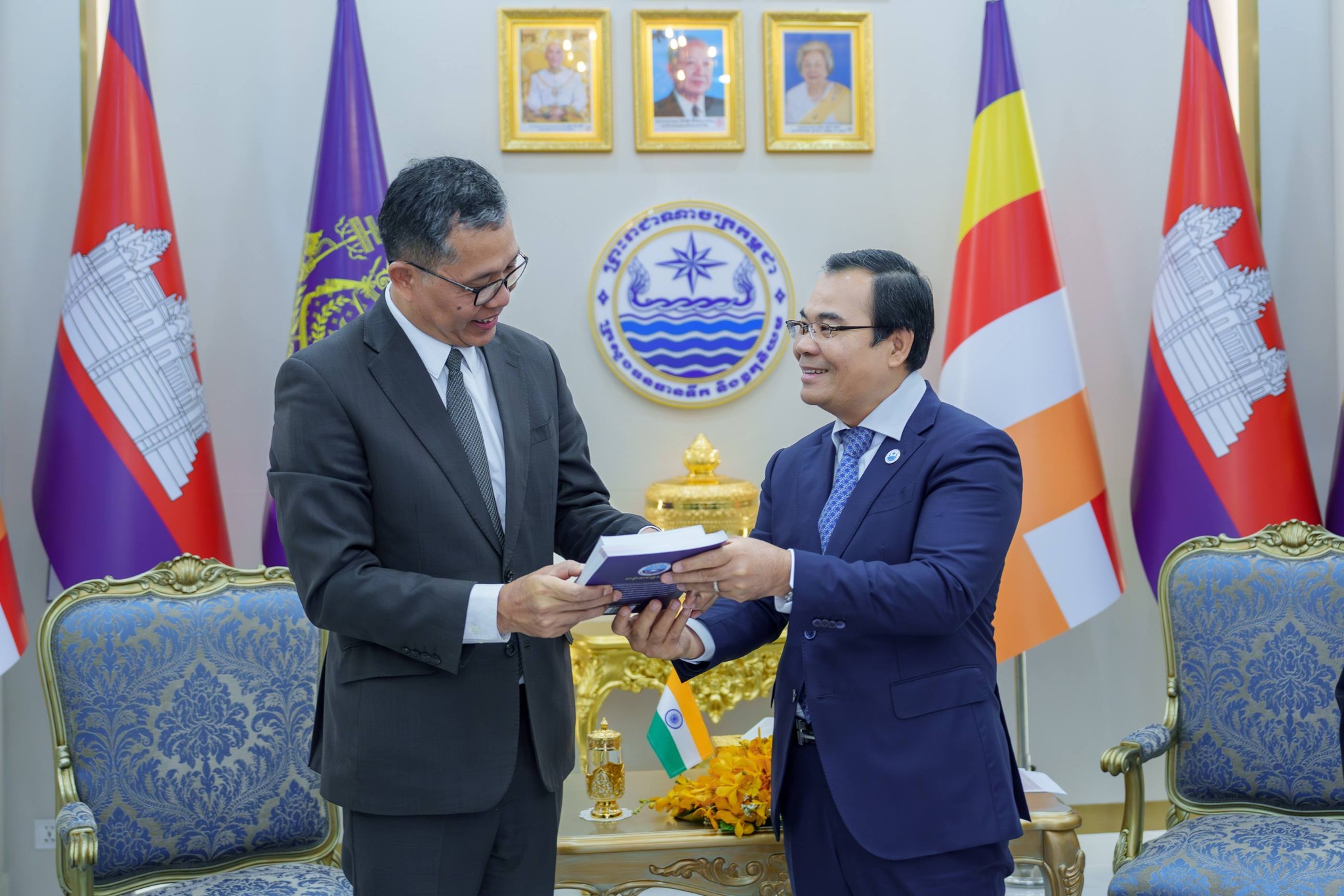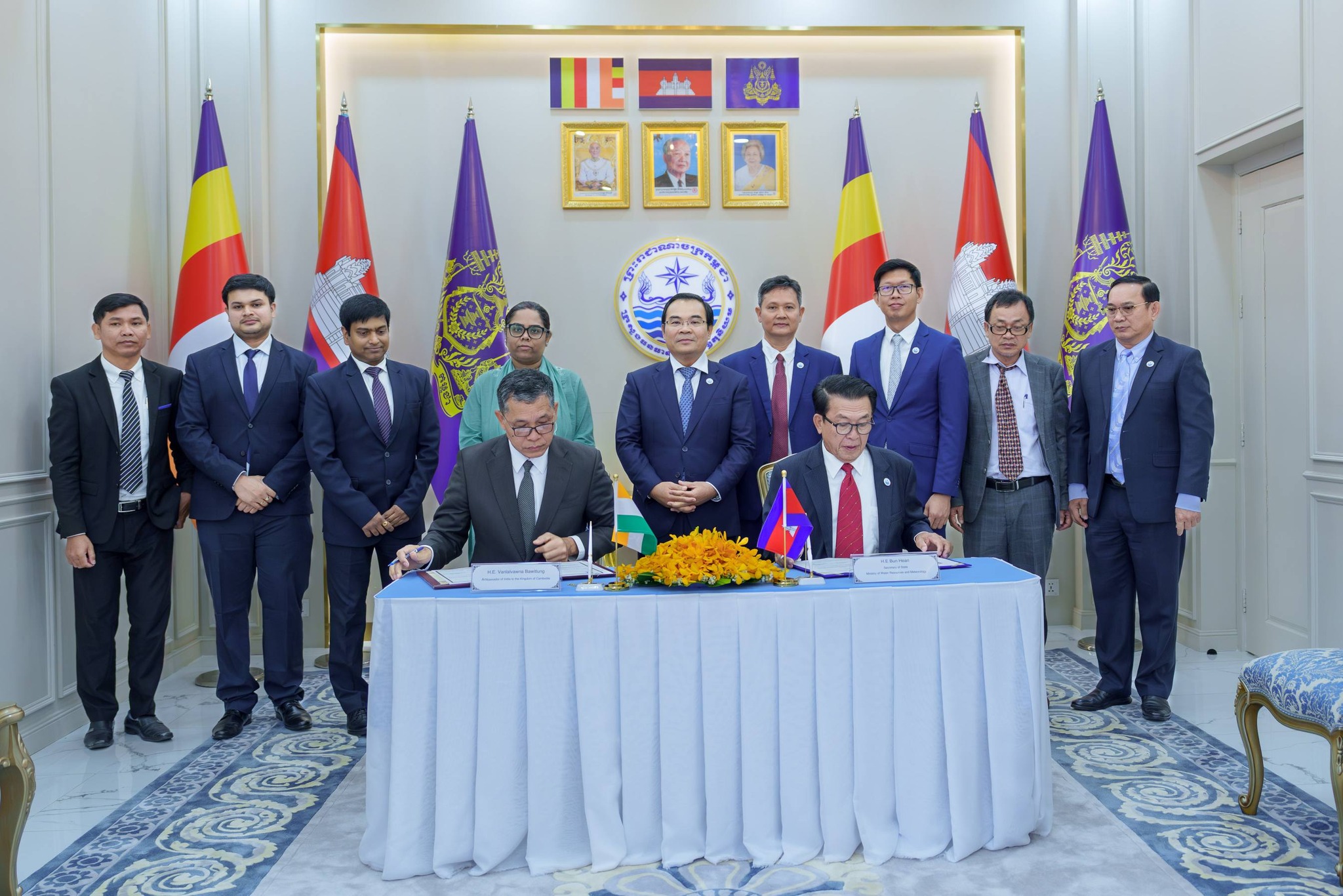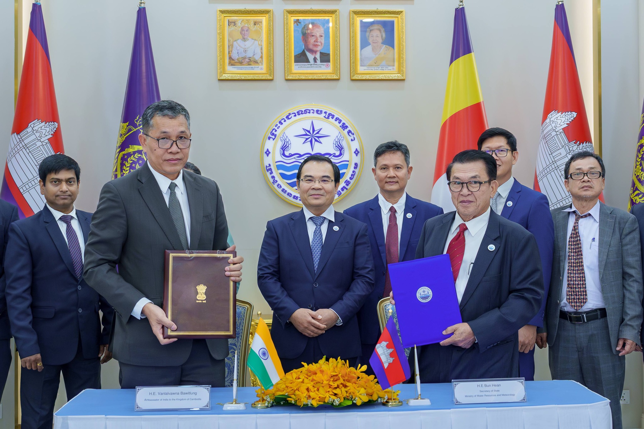 In response, the Ambassador highly appreciated the cooperation achieved in the past and expressed his admiration for the Royal Government of Cambodia, particularly the leadership of the Ministry of Water Resources and Meteorology, for their effective and efficient collaboration, and reaffirmed his commitment to further strengthening the excellent relations between the two countries to support socio-economic development in Cambodia and expand cooperation in the water resources sector, and on the same occasion His Excellency the Minister presided over the signing ceremony of a Memorandum of Understanding between H.E. Vanlalvawna Bawitlung, Ambassador of India to Cambodia, and His Excellency Bun Hean, Secretary of State of the Ministry of Water Resources and Meteorology, under which the Government of India provides a grant of USD 99,255 to Cambodia for a project to strengthen weather monitoring capacity in Siem Reap Province in support of public welfare and the regional economy.