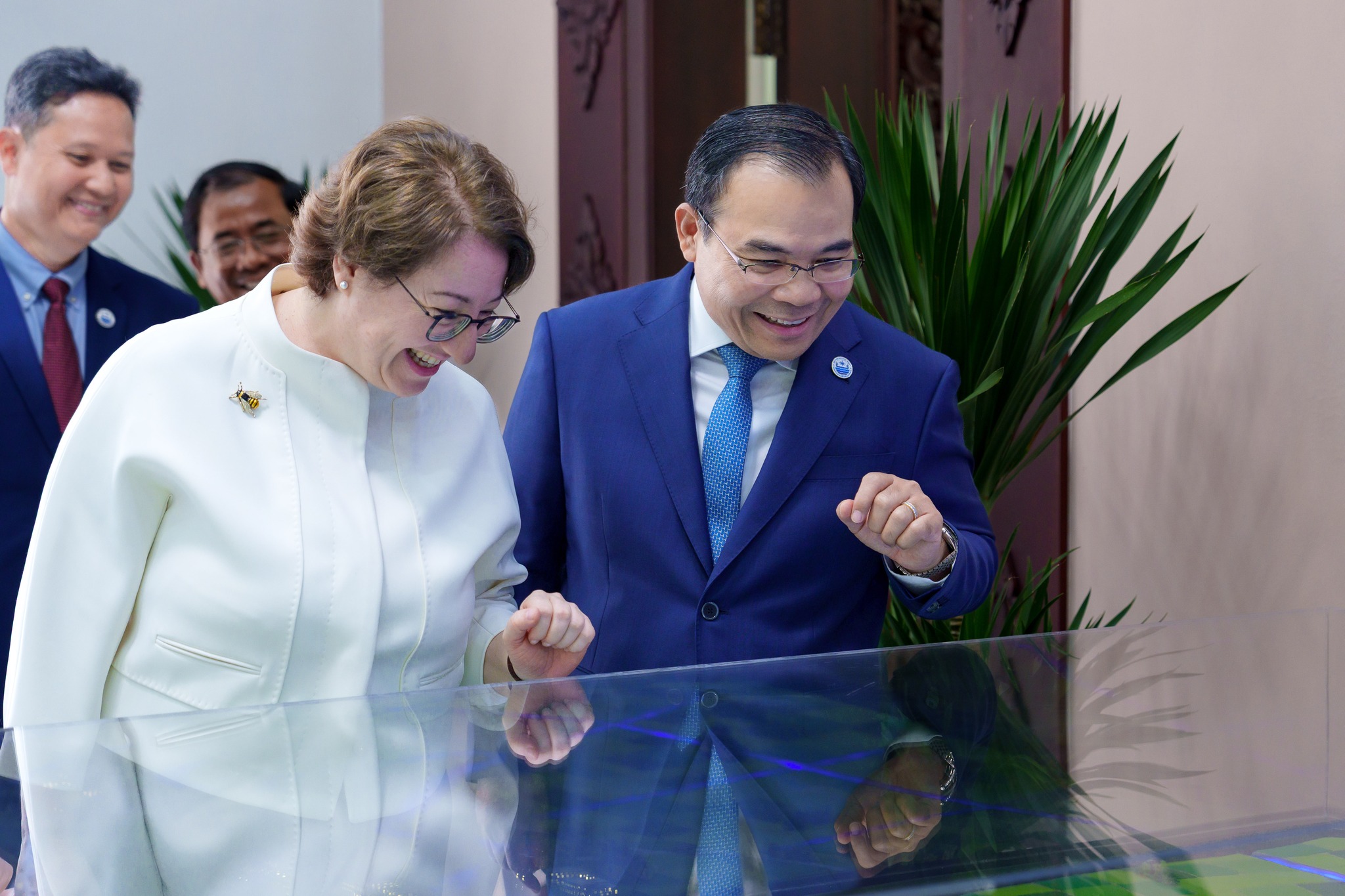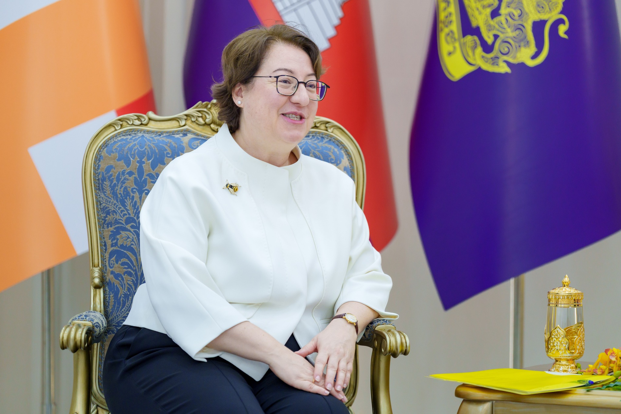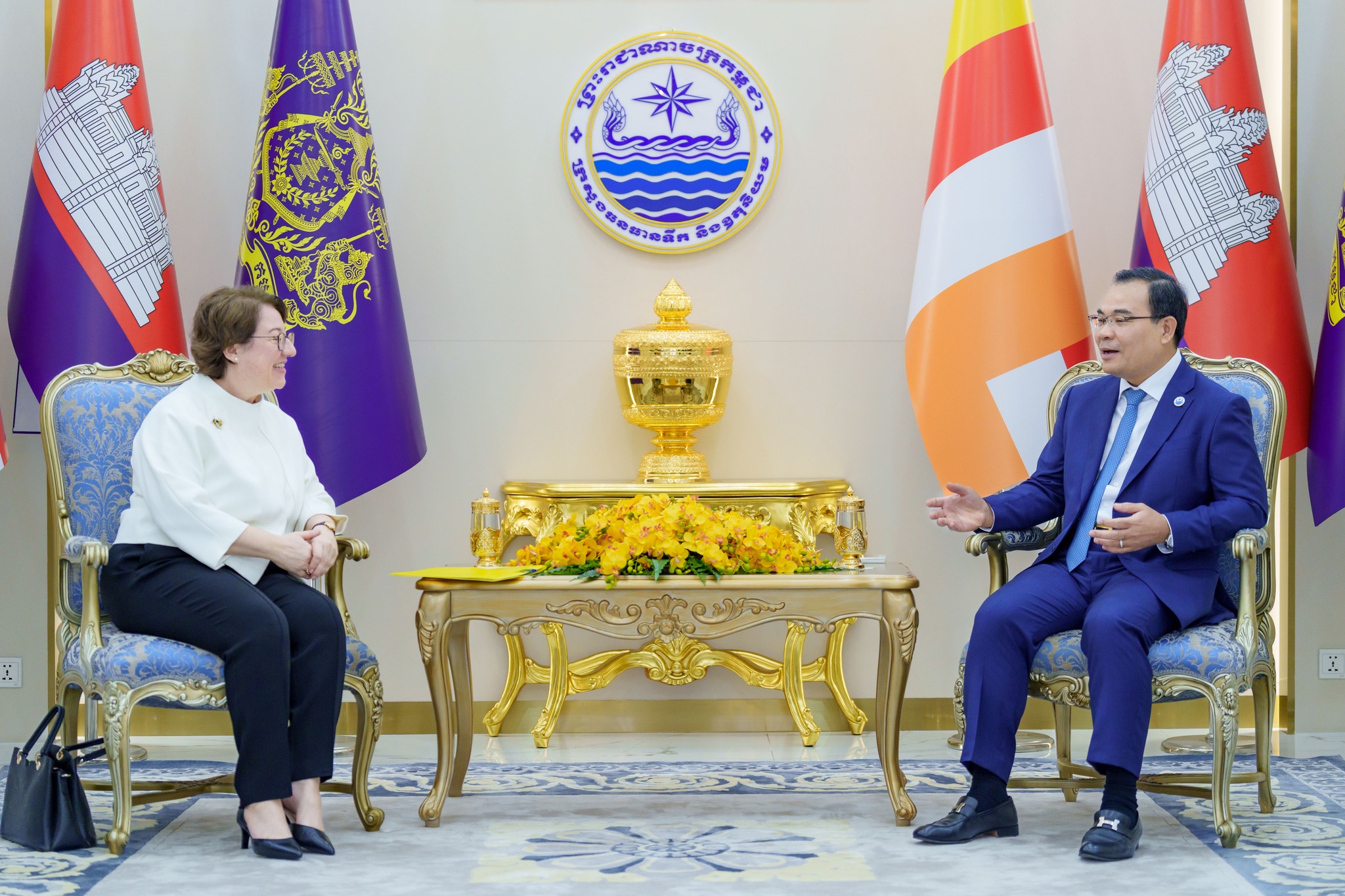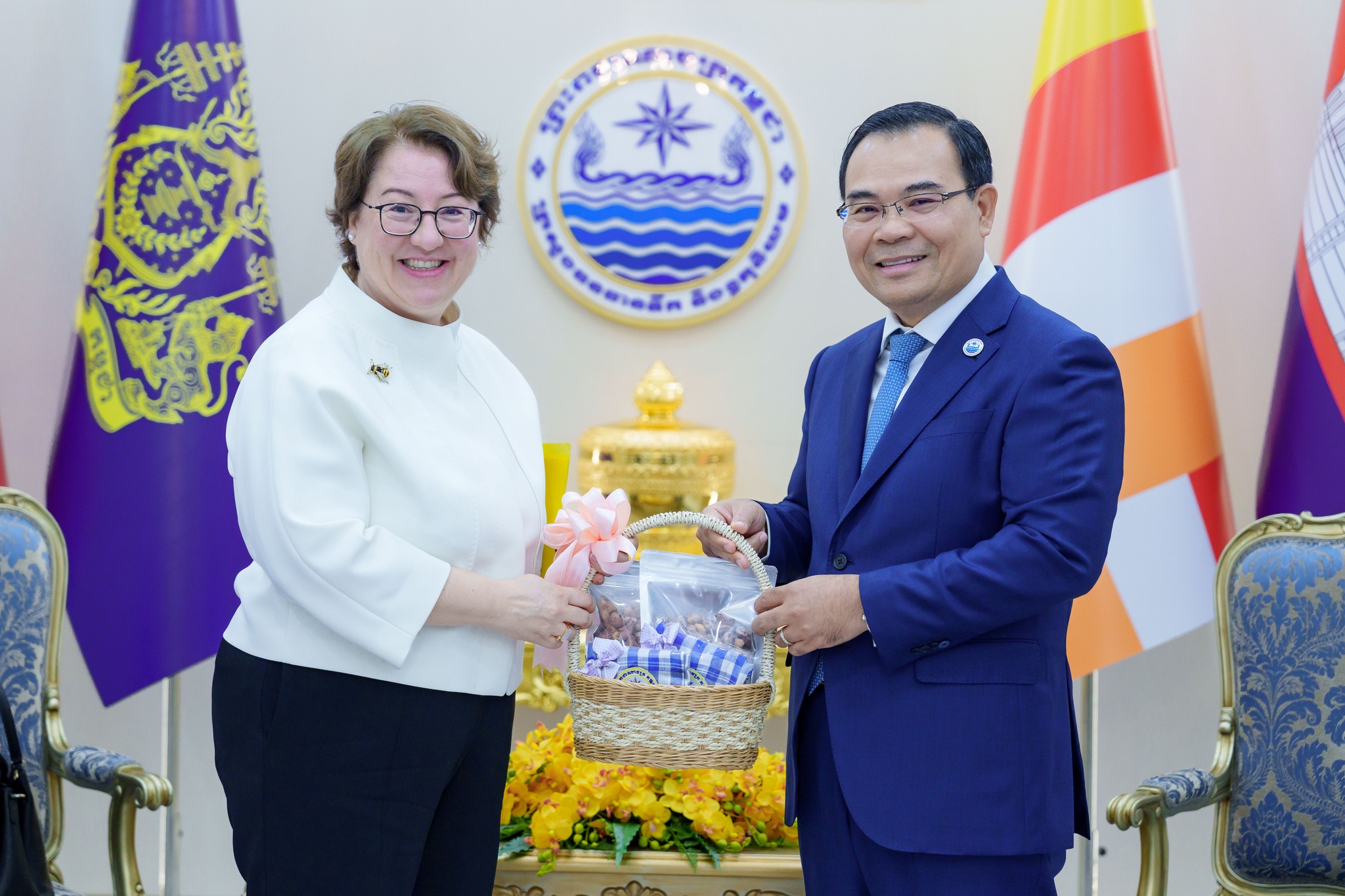 ក្នុងជំនួបពិភាក្សានោះ ឯកឧត្ដមរដ្ឋមន្ដ្រី បានជម្រាបជូនលោកជំទាវឯកអគ្គរដ្ឋទូត អំពីបេសកកម្ម និងគោលនយោបាយអាទិភាពរបស់ក្រសួង ស្របតាមយុទ្ធសាស្ត្របញ្ចកោណ ដំណាក់កាលទី១ របស់រាជរដ្ឋាភិបាលកម្ពុជា។ ក្រសួងកំពុងផ្តោតការយកចិត្តទុកដាក់ខ្ពស់លើការគ្រប់គ្រងធនធានទឹកប្រកបដោយចីរភាព ការកសាង និងស្តារឡើងវិញនូវប្រព័ន្ធធារាសាស្ត្រទំនើបៗ ដើម្បីធានាសន្តិសុខទឹកសម្រាប់បម្រើឱ្យការប្រើប្រាស់ក្នុងជីវភាពប្រចាំថ្ងៃ វិស័យកសិកម្ម និងឧស្សាហកម្ម ព្រមទាំងការងារព្យាករណ៍ឧតុនិយមឱ្យកាន់តែមានសុក្រឹតភាពខ្ពស់ ដើម្បីកាត់បន្ថយហានិភ័យពីគ្រោះមហន្តរាយធម្មជាតិ និងការប្រែប្រួលអាកាសធាតុ។
