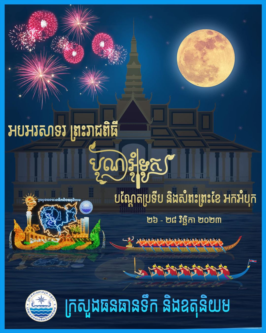 Shareអបអរសាទរ ព្រះរាជពិធីបុណ្យអុំទូក បណ្ដែតប្រទីប និងសំពះព្រះខែ អកអំបុក ២៦ - ២៨ វិច្ឆិកា ឆ្នាំ២០២៣