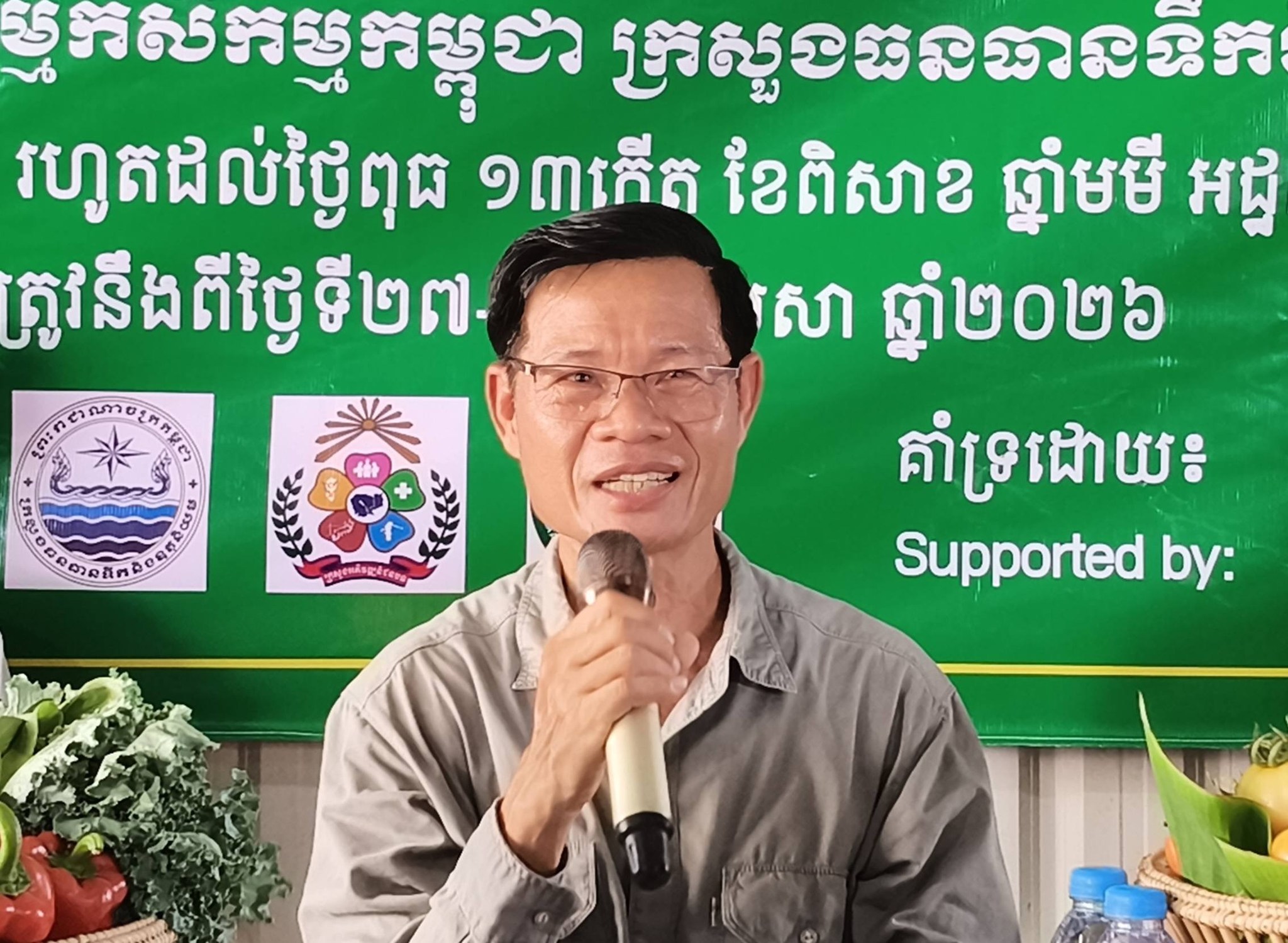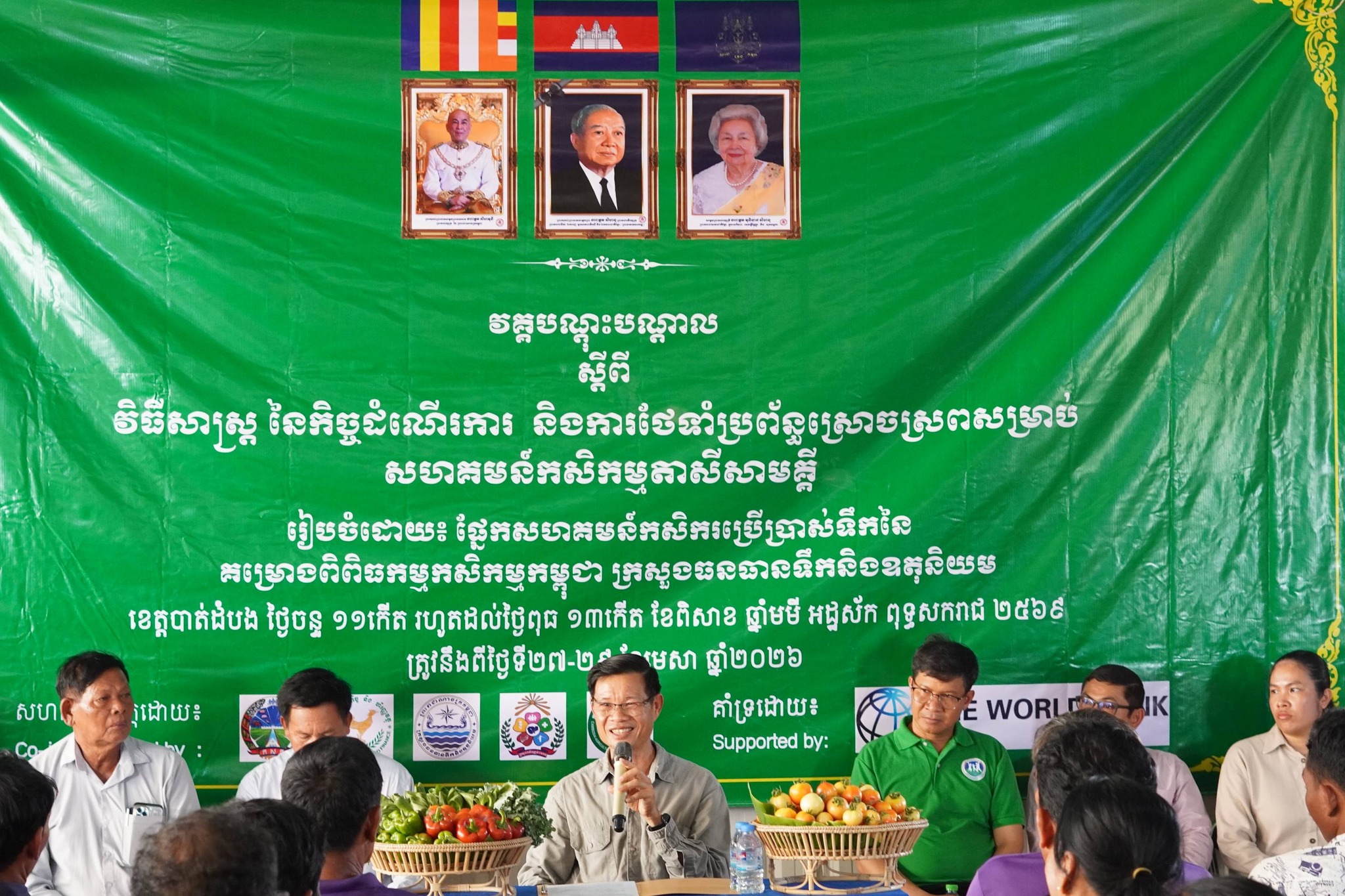 នាព្រឹកថ្ងៃចន្ទ ១១កើត ខែពិសាខ ឆ្នាំមមី អដ្ឋស័ក ព.ស.២៥៦៩ ត្រូវនឹងថ្ងៃទី២៧ ខែមេសា ឆ្នាំ២០២៦ លោក តាំង សុផាត អគ្គនាយករងនៃអគ្គនាយកដ្ឋានកិច្ចការបច្ចេកទេស និងជានាយកអង្គភាពអនុវត្តគម្រោងពិពិធកម្មកសិកម្មកម្ពុជា តំណាងដ៏ខ្ពង់ខ្ពស់ ឯកឧត្តម ថោ ជេដ្ឋា រដ្ឋមន្ត្រីក្រសួងធនធានទឹក និងឧតុនិយម បានអញ្ជើញជាអធិបតីក្នុងពិធីបើកវគ្គបណ្តុះបណ្តាល ស្តីពី «កិច្ចដំណើរការ និងការថែទាំហេដ្ឋារចនាសម្ព័ន្ធប្រព័ន្ធធារាសាស្ត្រ» រៀបចំឡើងនៅទីតាំងសហគមន៍កសិកម្មតាសីសាមគ្គី ស្ថិតក្នុងភូមិតាសី ឃុំតាម៉ឺន ស្រុកថ្មគោល ខេត្តបាត់ដំបង។