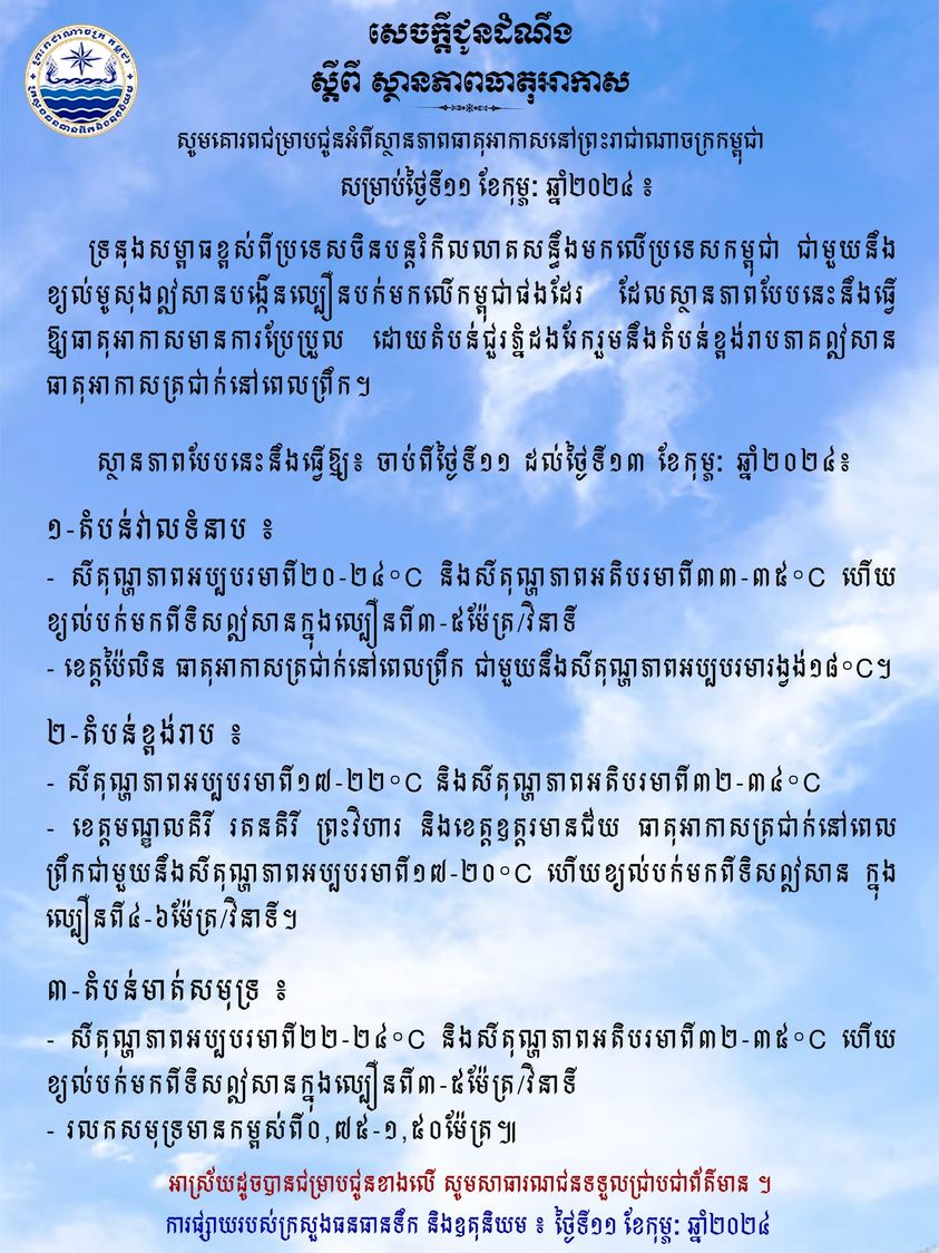 Shareសូមគោរពជម្រាបជូនអំពីស្ថានភាពធាតុអាកាសនៅព្រះរាជាណាចក្រកម្ពុជាសម្រាប់ថ្ងៃទី១១ ខែកុម្ភៈ ឆ្នាំ២០២៤៖