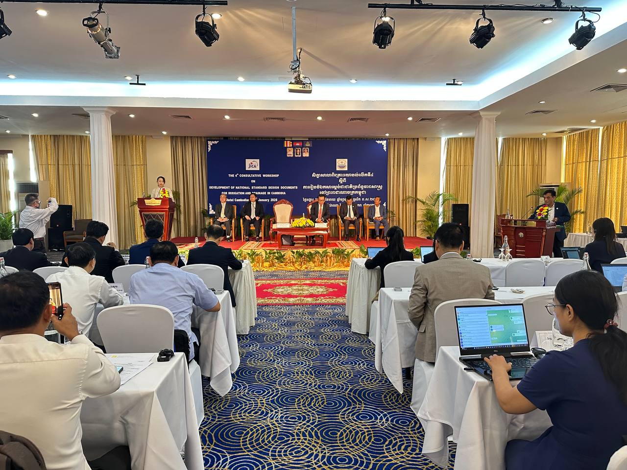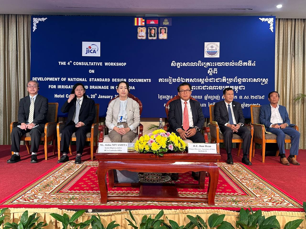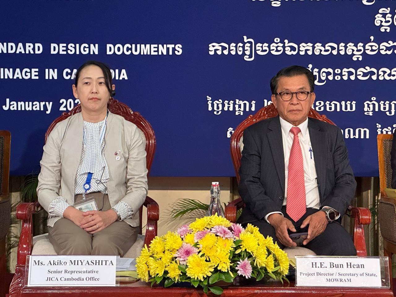 នាព្រឹកថ្ងៃអង្គារ ២កើត ខែមាឃ ឆ្នាំម្សាញ់ សប្តស័ក ពុទ្ធសករាជ ២៥៦៩ ត្រូវនឹងថ្ងៃទី២០ ខែមករា ឆ្នាំ២០២៦ នៅសណ្ឋាគារកាំបូឌីយ៉ាណា ឯកឧត្តម ប៊ុន ហ៊ាន រដ្ឋលេខាធិការ និងជានាយកគម្រោងស្តង់ដាជាតិប្រព័ន្ធធារាសាស្រ្ត ក្នុងនាមតំណាងដ៏ខ្ពង់ខ្ពស់ឯកឧត្តម ថោ ជេដ្ឋា រដ្ឋមន្រ្តីក្រសួងធនធានទឹក និងឧតុនិយម និងលោកស្រី Miyashita AKiko អនុប្រធានទីភ្នាក់ងារសហប្រតិបត្តិការអន្តរជាតិនៃប្រទេសជប៉ុន (JICA) អញ្ជើញចូលរួមជាសហអធិបតីក្នុងពិធីបើកសិក្ខាសាលាពិគ្រោះយោបល់លើកទី៤ ស្តីពីការរៀបចំឯកសារស្តង់ដាជាតិប្រព័ន្ធធារាសាស្ត្រ ដោយមានការចូលរួមពីតំណាងក្រសួង-ស្ថាប័នពាក់ព័ន្ធ ដៃគូអភិវឌ្ឍន៍ មន្ត្រីនាយកដ្ឋាន និងមន្ទីររាជធានី-ខេត្តទាំង២៥ ព្រមទាំងតំណាងកុងស៊ុលតង់សរុបចំនួន ៧០នាក់។